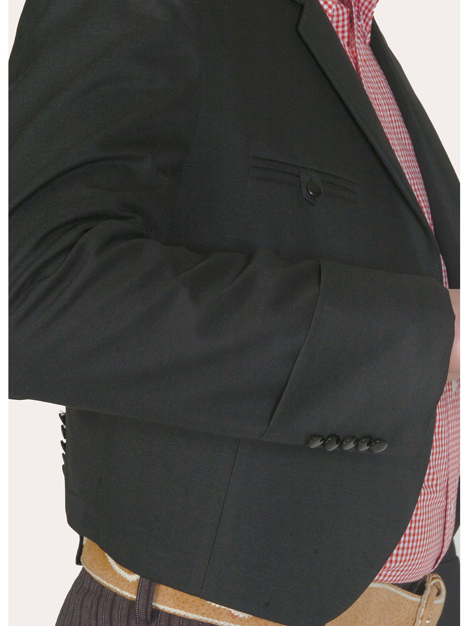 Confeccionada en tela casimir, su estructura forrada y fusionada asegura comodidad, ajuste perfecto y una caída impecable. Destaca por su cuello mellado delantero, su doble ribete recto con pestañas en los bolsillos de pecho y sus mangas con bota y cinco botones, elementos que realzan su carácter artesanal y su fidelidad al diseño original.