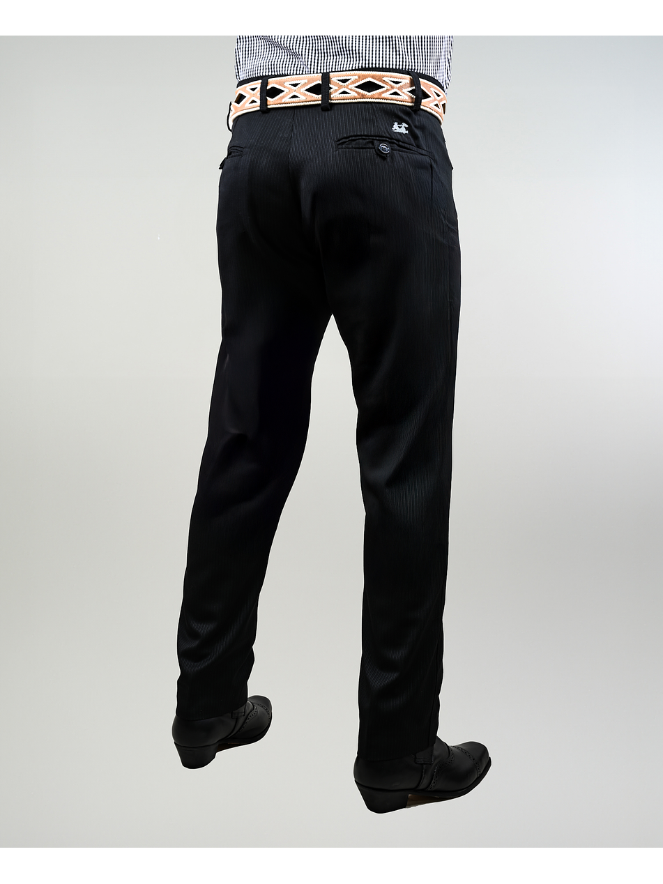Su diseño incluye una pretina con dos botones y pasadores anchos, asegurando un ajuste firme y cómodo. El cierre metálico y los dos bolsillos traseros ofrecen funcionalidad práctica sin perder el toque tradicional del pantalón corralero.