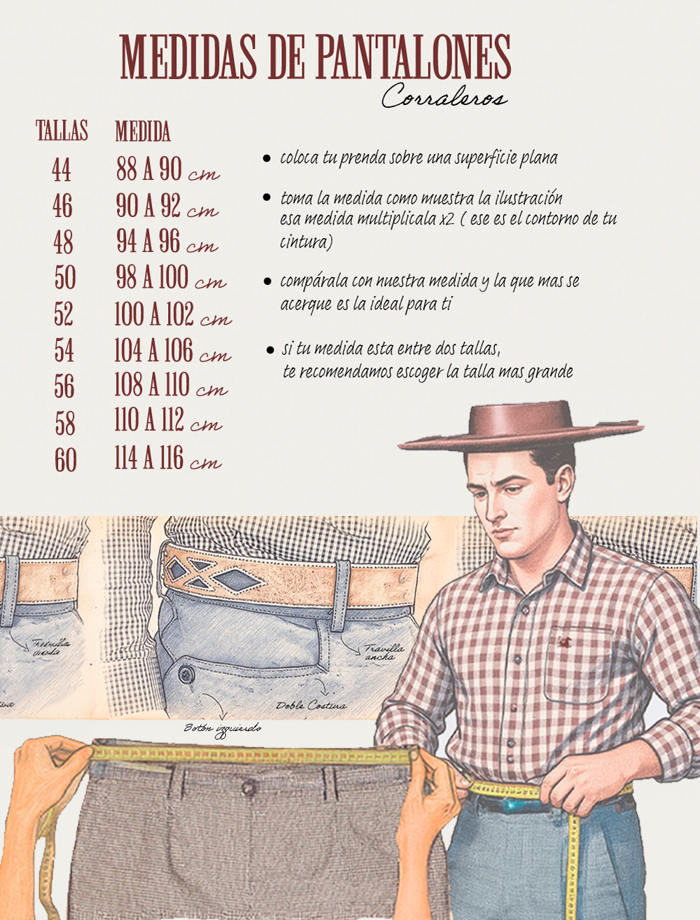 Este modelo se distingue por su pretina con dos botones y pasadores anchos, que proporcionan un ajuste firme y cómodo. El cierre metálico y los dos bolsillos traseros funcionales añaden practicidad sin perder el toque clásico que caracteriza al atuendo huaso.